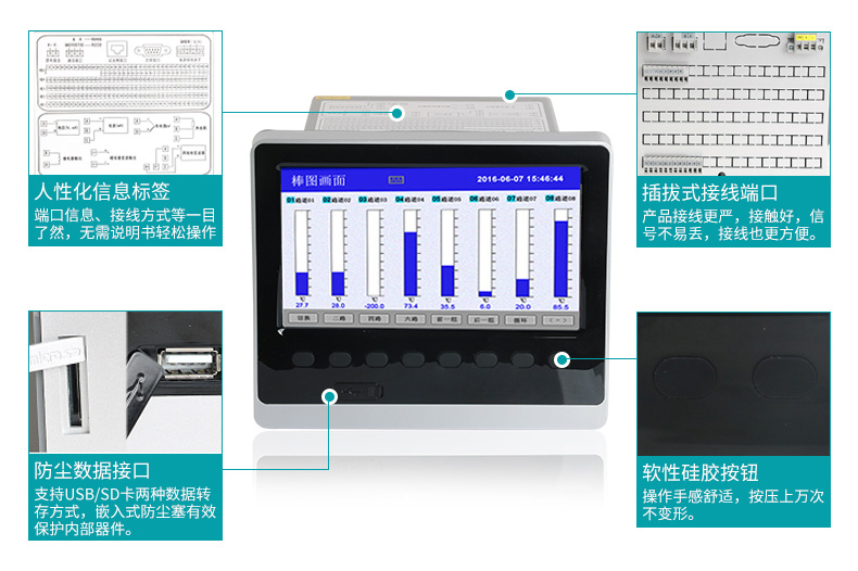 MIK-R6000C系列彩色無紙記錄儀48路(不含報警,變送等其它功能)萬能輸入(可組態(tài)選擇輸入:標(biāo)準(zhǔn)電壓、標(biāo)準(zhǔn)電流、熱電偶、熱電阻、頻率、毫伏等)。可帶18路報警輸出,12路變送輸出,RS232/485通訊接口,以太網(wǎng)接口,微型打印機接口和USB接口,SD卡插座;可供傳感器配電;具有強大的顯示功能,實時曲線顯示,歷史曲線追憶,棒圖顯示,報警列表顯示。人性化的外觀設(shè)置以及功能體現(xiàn)、可靠的硬件品質(zhì)、精湛的制造工藝,使MIK-6000C具有更高的性能性價比。